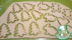 Я вырезала формочками для печенья ёлочки, зайчиков, сердечки и пару мишек.