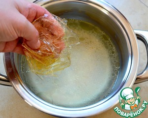 Отварить куриные бедрышки с очищенной морковью и луковицей до готовности мяса. Достать куски курицы из бульона и дать остыть. Луковицу выбросить. 500 мл бульона профильтровать через мелкое ситечко и отставить в сторону. Если есть необходимость, можно его осветлить сырым куриным белком. Но, я в процессе варки бедер регулярно убираю образовывающуюся пену, поэтому в итоге, бульон получается достаточно прозрачным сам по себе.