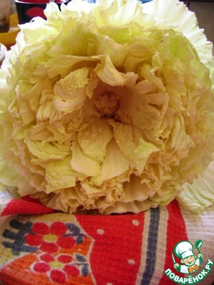 Удалить у капусты верхние листья, хорошо промыть между листьями, дать воде стечь. Макушку обрезать – как на фото, формируя цветок пиона.