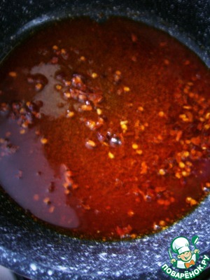 Раскалите масло, снимите сковороду с огня и быстро всыпьте хлопья чили и паприку. Размешайте и влейте в овощную смесь. Еще раз перемешайте.