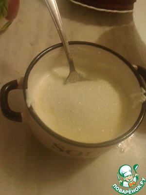 Приготовить пропитку для коржей. Воду соединить с сахаром и вареньем. Пропитать коржи.