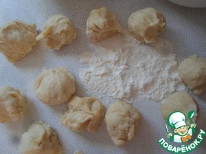 Расстоявшееся тесто разделяем на кусочки (можно сделать маленькие как у меня, либо 2 больших, большие будут очень мягкие и сильно увеличатся).