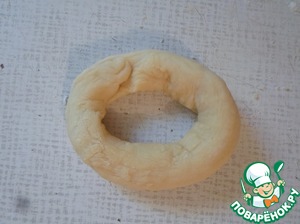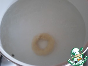 Кусочек раскатываем в колбаску длинной около 15 см, толщиной около 1,5 см. Сворачиваем в кольцо. Даем расстояться 15 минут. За это время разогреваем духовку до 200 градусов. А в кастрюлю наливаем воду и доводим до кипения.