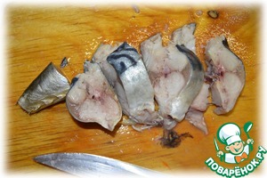 Скумбрию разрезать по брюшку, вынуть внутренности, отрезать голову, тушку промыть.