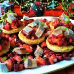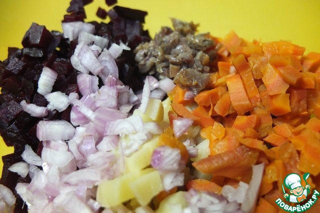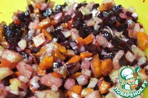 Остывшие овощи очищаем, режем мелким кубиком. Добавляем мелко нарезанный лук-шалот и анчоусы. -