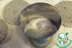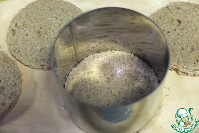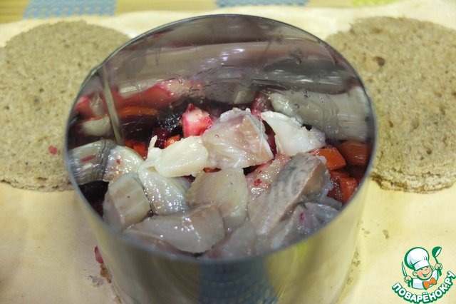 Кулинарным кольцом вырезаем из хлеба основу для салата. Сельдь нарезаем на кусочки.