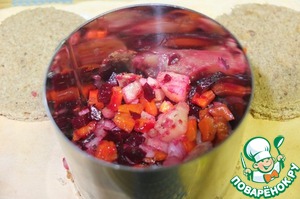 Сверху выкладываем слой нарезанной сельди. Затем еще ложку салата, утрамбовываем и снимаем кулинарное кольцо.