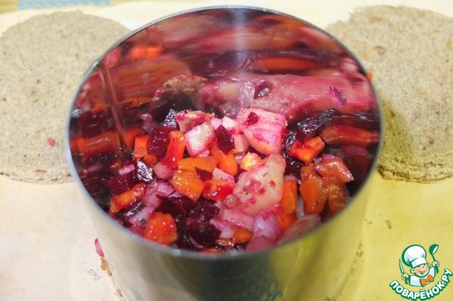 На дно кулинарного кольца кладем хлеб, затем выкладываем столовую ложку салата.