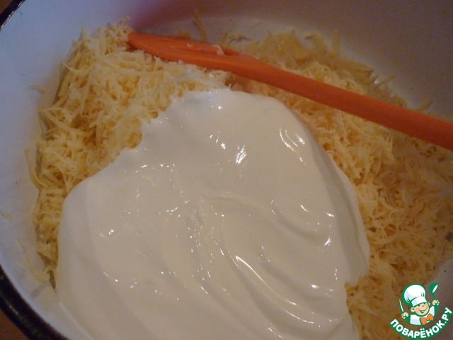 Сыр натереть на мелкой тёрке, смешать со сметаной...
