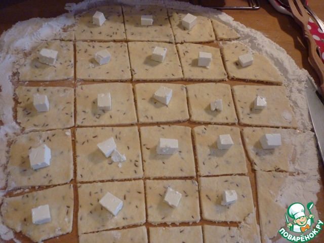Брынзу нарезать на кубики (1*1). Тесто раскатать на присыпанной мукой поверхности в пласт толщиной 0,5 см. Разрезать тесто на квадратики 3,5*3,5 или 4*4см. В каждый квадратик положить по кубику брынзы