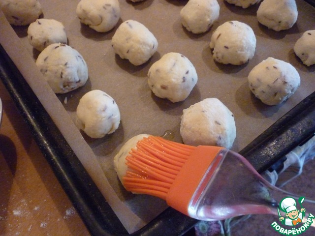 Сформировать шарики. Выложить на противень, на пергаментную бумагу или смазать противень маслом. Смазать печеньки маслом.