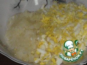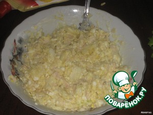 В салат добавить мелко нарезанный лук, майонез, посолить по вкусу.