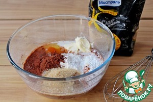 Для этого в миске смешать мягкое сливочное масло, яйца, молоко, сахар демерара ТМ Мистраль, какао порошок, муку, разрызлитель и молоко.