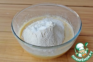 Добавить просеянные муку и разрыхлитель, перемешать до однородности.