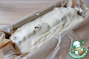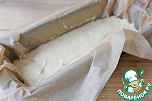 Форму для кекса выстелить пергаментом и вылить половину теста для кекса.
