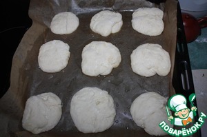 Тесто обмять, разделить на 9 частей, выложить на смазанный маслом противень. Оставить в теплом месте. чтобы тесто второй раз подошло.