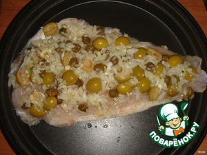В жароупорную посуду уложить 2 филе рыбы, сверху - искрошенный лук с оливками, каперсами и чесноком. Если у вас всего два филе, то в посуду укладывается только 1, на него начинка.