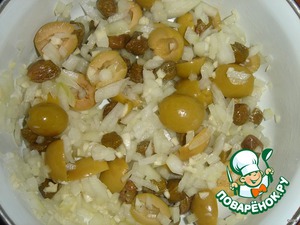 Искрошить мелко лук, добавить в него разрезанные пополам оливки, мелко рубленный чеснок, каперсы.