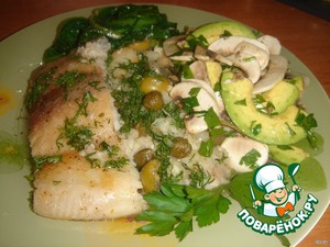В оригинальном рецепте эта рыбка подается с салатом из шампиньонов и авокадо. Рецепт здесь http://www.povarenok .ru/recipes/show/118 17