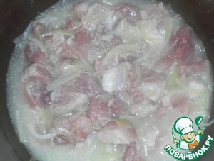 К луку добавляем мясо, слегка обжариваем, наливаем немного водички и тушим.
