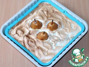 Готовый кухен достаем из духовки. Выкладываем на него безе. Три верхушки от груш макаем (только донышко) в крахмал и укладываем в середину, немного углубляем. Ставим снова кухен в духовку, уже на 10 минут.