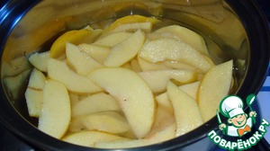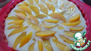 Достаем основу из духовки, выливаем сверху крем и выкладываем кусочки айвы, которую перед этим откинули на дуршлаг. Отправляем назад в духовку на 35-40 минут.