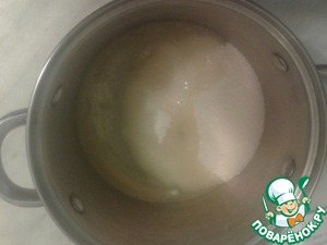 Ставим кастрюлю на маленький огонь и постоянно взбиваем до полного растворения сахара. Это займет около 2-3 минут. Нам необходимо, чтобы просто растворился сахар, то есть взбивать до крепкой пены не надо.