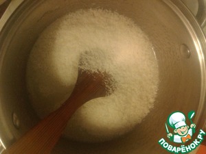 Далее в ход идет кокосовая стружка, печенье из которой мы готовим. Кладем ее в кастрюлю.