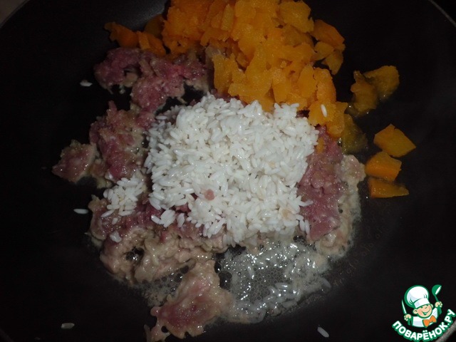 В это же время отправляем на сковороду фарш, рис и мелко нарезанную сердцевину репы.