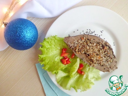 Фаршируем печень нашей гречневой кашей, край скрепляем зубочистками. Печень солим и перчим по вкусу.