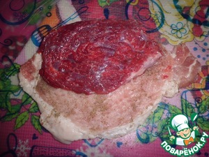 • Свинину и говядину нарезать на пласты, примерно 0,7 мл.
