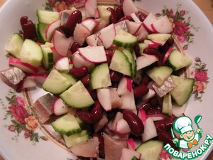 Редис и огурцы смешать, посолить, добавить фасоль, селедку, перемешать, заправить оливковым маслом.
