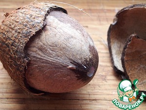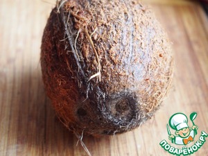 Пробуем проткнуть глазки кокоса острым предметом, находим самый мягкий, делаем в нем отверстие (я сделала это штопором :)) и сливаем водичку через него. Водичку можно выпить, но я ее не люблю. Затем тупой стороной топорика надо бить по кокосу, пока не образуется трещина, и кокос разломится на две половинки (у меня разломился не совсем ровно, наверное, надо было бить в одно и то же место).