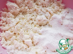 К измельченной мякоти кокоса добавляем творог, сахарную пудру и сгущенное молоко. Хорошо перемешиваем. Масса должна получиться достаточно густой и лепиться.
