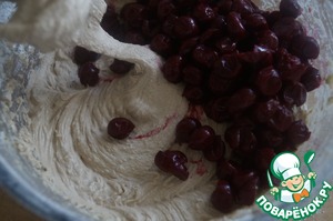 Добавить какао, муку смешанную с разрыхлителем и перемешать при помощи миксера на низкой скорости. Добавить вишню (без сока, предварительно немного отжав вишню). Перемешать лопаткой, чтобы вишня распределилась по всему тесту.
