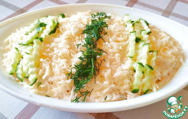 Сыр так же натираем на мелкой терке. Дальше выкладываем слоями начиная снизу: