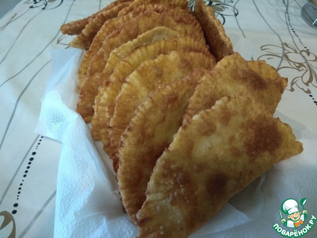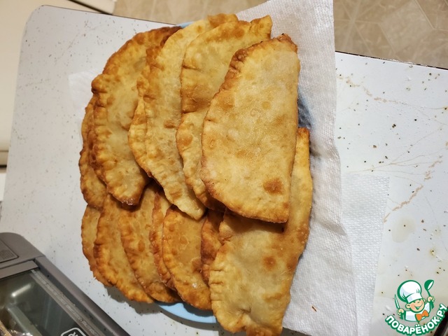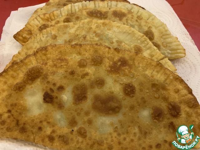Готовые чебуреки сложить на впитывающую бумагу (бумажное полотенце).