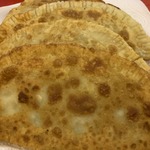 Итак, раскатать из теста лепёшку и распределить фарш тонким слоем по половине лепёшки.
