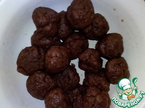 Для теста маргарин растопить, добавить воду, муку, сахар и какао. Замесить тесто.