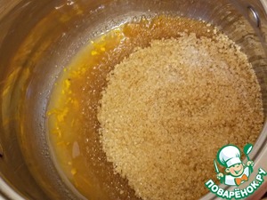 В кастрюлю вылить сок, высыпать сахар, именно коричневый и положить цедру.