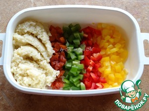 Перцы, курагу порезать кубиками, добавить пшено, подсолить, перемешать;