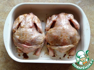 Цыплят выложить в форму для запекания, хорошо смазать со всех сторон соусом - оставить минут на 15;