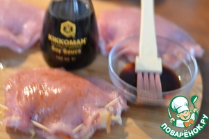 Смазать кисточкой с двух сторон отбивную соусом Киккоман. -