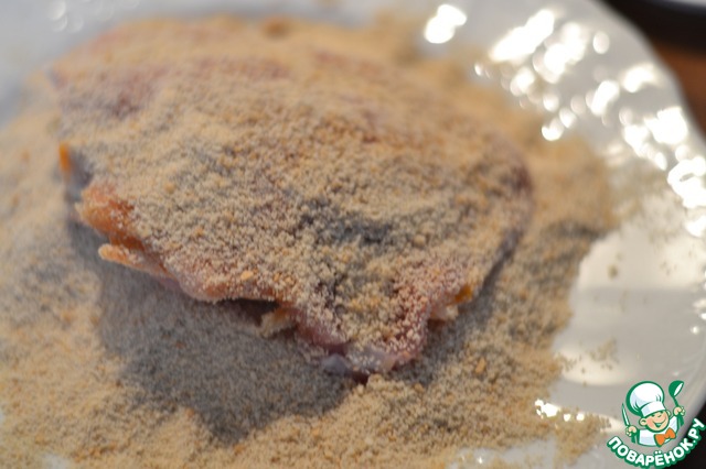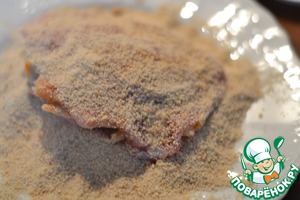 В панировочные сухари добавить соль и обвалять в них отбивные.
