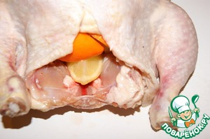 Поместить чеснок, дольки лимона и апельсина в брюшко курицы (сколько поместится).