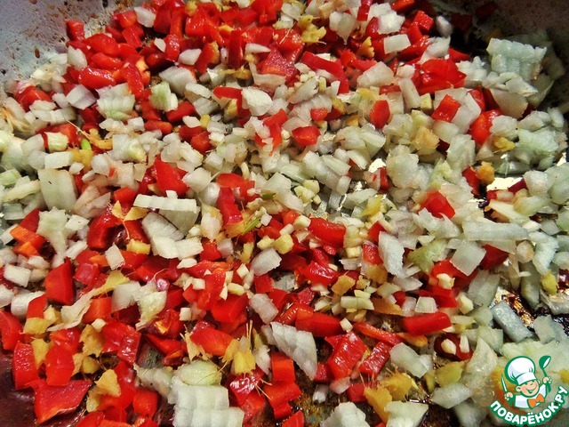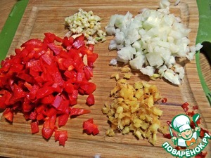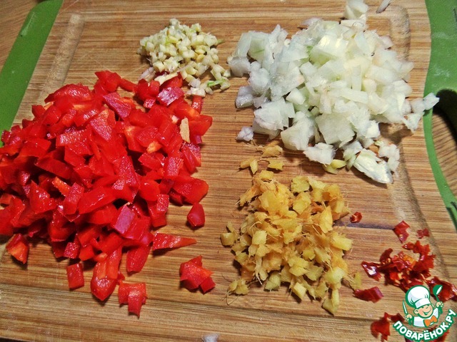• Измельчить в это время сладкий перец, имбирь, лук, чеснок, перец чили.