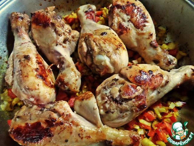 • Наливаем около стакана воды, накрываем крышкой и тушим на маленьком огне до готовности курицы. Иногда переворачиваем курицу и поливаем соусом.