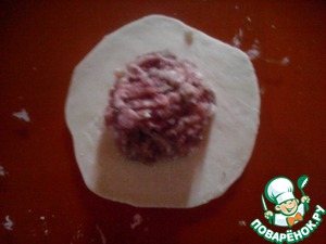 Скатать шарик из теста размером с грецкий орех, раскатать его скалкой в виде круга толщиной около 2 мм, размер круга примерно с ладонь.