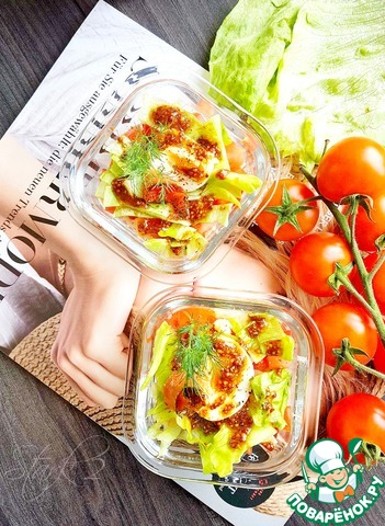 Укладывайте салат слоями, поливая каждый слой заправкой на свой вкус. Яйцо нарубите мелко и посыпьте салат сверху, либо нарежьте кружочками (как у меня)