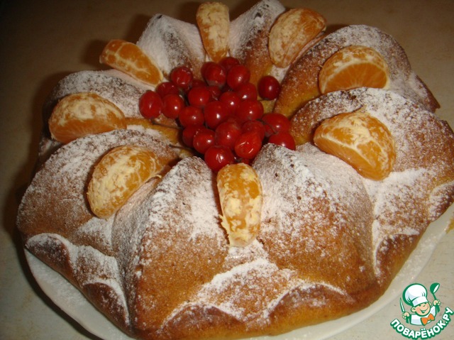 Кекс выньте из формы, посыпьте сахарной пудрой, полностью остудите и украсьте дольками мандарина и ягодами.